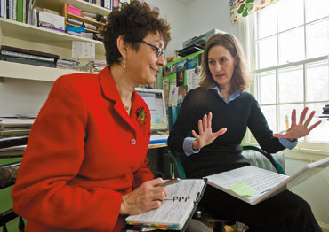 Stephanie Jutt (left), professor of music, and Samantha Crownover (right), executive director of the Bach Dancing and Dynamite Society of Wisconsin, collaborate at Crownover’s home office on plans for the upcoming Arts Enterprise Symposium. The Arts Enterprise Initiative for Arts Entrepreneurship is a new organization headed by Jutt that is designed to teach hands-on survival skills to young artists in the performing and visual arts.