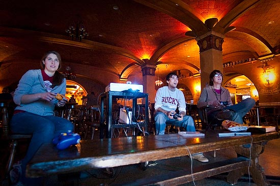Three students compete in a game of Super Smash Brothers Brawl in the Memorial Union Rathskeller on Feb. 19, 2009.
