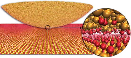 The UW-Madison team performed computer simulations that looked at nanoscale materials as a collection of atoms, monitoring their positions and interactions throughout the entire sliding process. "For the first time, we modeled friction at length scales very similar to experiments, while maintaining atomic resolution and realistic interactions between atoms," say Szlufarska.