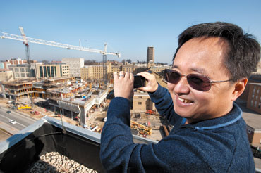Sangtae Kim, director of the Morgridge Institute for Research, enjoys a rooftop vantage point to photograph Phase I construction of the Wisconsin Institutes for Discovery. Kim was standing on the roof of the Computer Sciences and Statistics building.