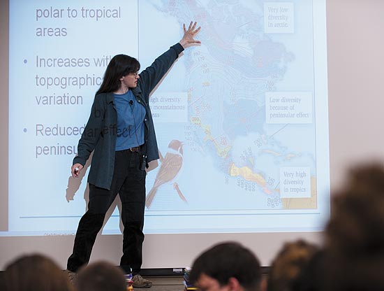 Sara Hotchkiss, assistant professor of botany, teaches Introductory Biology 152, a required course for biology majors, in a lecture hall in Bascom Hall.