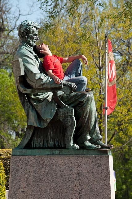 Feeling on top of the world after completing the last final exam of his undergraduate career, Jacob Broullire sits on the Abraham Lincoln statue on Bascom Hill on May 12, 2009. Broullire will receive a bachelor’s degree in zoology on Sunday afternoon during the last of five weekend commencement ceremonies at the Kohl Center May 15-17. This summer, Broullire plans to travel around the world with a college buddy, who is also graduating.