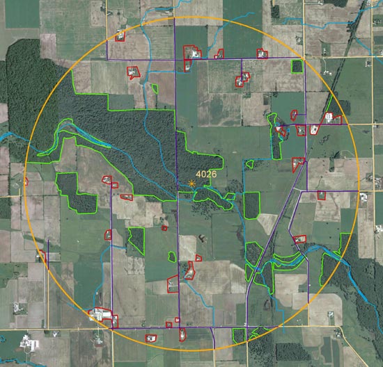 Ecologists are finding that the ecological health of patches of southern Wisconsin’s forests (such as this one outlined in green) are strongly impacted by the number of nearby farm fields, buildings (red), and roads (purple). Forest fragmentation by increasing development is reducing the abundance and diversity of native plants, according to a new study led by UW-Madison ecologist Don Waller.