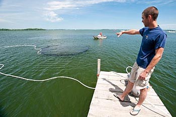 Jordan Read, a doctoral candidate in civil and environmental engineering, explains the mechanics of a water-mixing experiment as equipment is tested near the Limnology pier on Lake Mendota on July 9, 2009. The experiment, which involves a device that resembles a parachute with an inflatable ring, brings water from the bottom of a lake to the surface and raises the temperature of the deeper water. The experiment has implications for studying the effects of global warming as well as the effects of water temperature change on invasive species in lakes.
