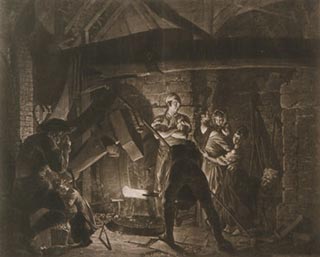 Mezzotint techniques allow artists to explore shadows, creating works with drama and mood. This print, “An Iron Forge,” is from 1778.