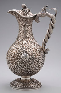But forget plain, aristocratic, stiff upper lips in the designs. The Indian silversmiths decorated the surfaces with ornate embellishments, often displaying distinctive regional Indian styles. Some artists created works that are heavily embossed. Others incorporated animals, such as a twisted snake for a handle or an elephant head for a spout. Some works are decorated with images of gods, or rural scenes with depictions of people carrying water or plowing fields with a backdrop of palm trees and huts.