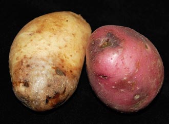 Pictured are two potatoes infected with late blight disease. A new study published in Nature, by an international group that includes University of Wisconsin-Madison researchers Shiguo Zhou and David C. Schwartz, shows the entire genetic sequence of late blight, the disease that caused the Irish potato famine in the 1840s.