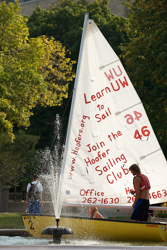 Calling attention to an upcoming informational meeting for their student organization, two Hoofer Sailing Club members sail a boat in circles in the Hagenah Fountain on Library Mall on Sept. 15, 2009.
