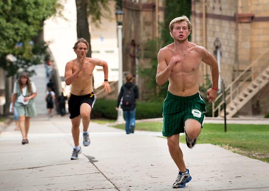 Undergraduates Luke Justinger (green shorts) and Matt Kvalo run a series of wind sprints up a Bascom Hill walkway on Sept. 23, 2009.