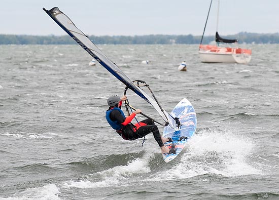 Harnessing the power of a windy day — 15 mph with occasional gusts to 40 mph — Hoofer Sailing Club instructor Andy Evenson windsurfs on Lake Mendota on Sept. 28, 2009.