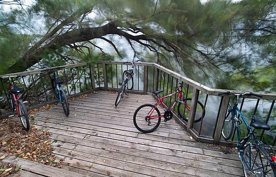 Bicycles locked to a deck railing along the Howard Temin Lakeshore Path are pictured against a painterly view of windblown willow-tree branches moving during a time exposure of several seconds on Sept. 28, 2009. In the background is Lake Mendota.