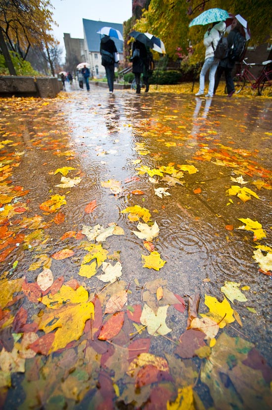 Umbrella-toting pedestrians make their way through soggy autumn leaves and endless puddles on Library Mall on Oct. 23, 2009.