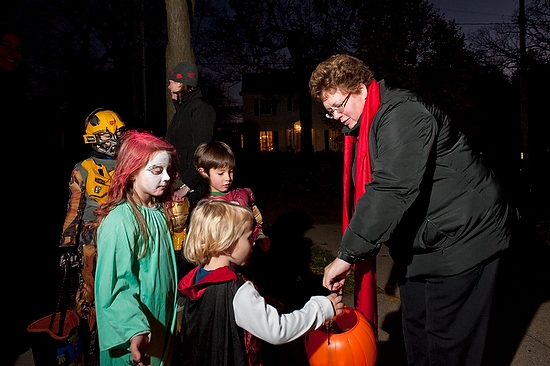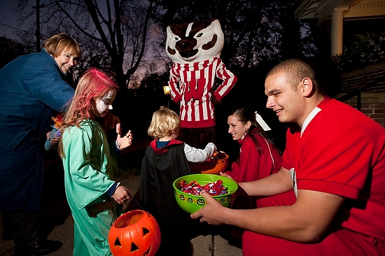 Bucky and some UW cheerleaders joined Chancellor Biddy Martin (below) at Olin House in handing out treats from 4-8 p.m., on Halloween.