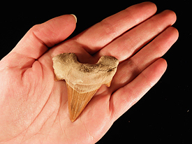 This fossilized tooth of a shark called Otodus obliquus that lived 45 to 60 million years ago will be available at the Holiday Sale at the University of Wisconsin-Madison Geology Museum Dec. 4, 2009. The shark may have reached 30 feet in length.