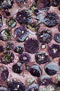 Pupa Gilbert, a professor of physics, has found a new mechanism that may explain how crystals form in many types of biominerals, including shellfish, eggshells and the enamel in human teeth. Gilbert made her discovery by studying the purple sea urchin Strongylocentrotus purpuratus, shown here in a tide pool at Point Arena, Calif., on Dec. 1, 2009.