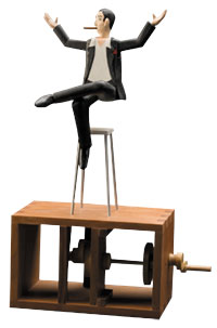 Vaucanson’s work launched a golden age of animated clockwork clowns, acrobats and entertainments, which were popular as parlor amusements and department store window displays until World War I. Today’s artist-designed automata often focus on imaginative storytelling and unreal playfulness using wood, metal and wire.