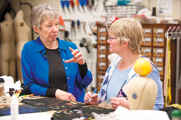 Deb Dryden (left), costume designer and textile artist currently serving as an artist in residence in the Department of Theatre and Drama, discusses techniques of fabric painting with student Sydney Krieger in her Textile Painting and Dyeing for Theatrical Design class in Vilas Hall.