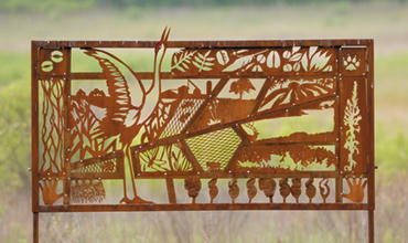 A piece of artwork, featuring wildlife themes shaped in rusted-metal, marks a foot path to the Curtis Prairie at the UW Arboretum.