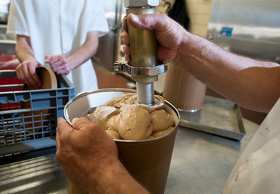 Ice cream and butter maker Tim Haas fills containers with In the Dark, an ice cream specialty flavor being produced during a 150-gallon run at the Babcock Diary Plant March 17, 2010.