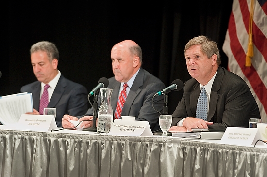 On June 25, U.S. Department of Agriculture Secretary Tom Vilsack (right), makes opening remarks during a forum on competition and regulatory issues in the dairy industry at the Memorial Union Theater at UW-Madison. Also pictured are U.S. Senator from Wisconsin Russ Feingold (left) and Wisconsin Gov. Jim Doyle (center).