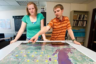 Graduate student Matthew Kogle (right) and recent graduate Kelly Hoehn (left) meet in Weeks Hall to discuss locations in southern Wisconsin that were visited as part of the USArray program. Kogle and Hoehn logged thousands of miles driving rural Wisconsin roads searching for appropriate locations and seeking permission from landowners to place the equipment on their property.