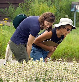 Jennifer Hopwood (left), pollinator specialist from the Xerces Society and Susan Carpenter, Arboretum native plant gardener, examine pollinators on dotted mint Aug. 3, 2010, during a workshop on native pollinators at the UW-Madison Arboretum, sponsored by the UW-Madison Center for Integrated Agricultural Systems.