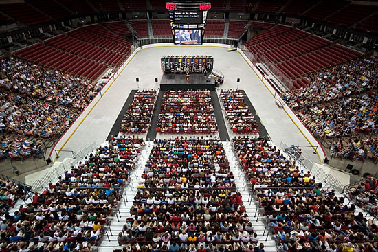 A crowd of more than 5,000 people fill the arena during the Chancellor’s Convocation for first-year students at the Kohl Center on Sept. 1, 2010.