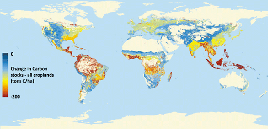 Changes in carbon stocks due to cropland conversion. Loss of forests and other native ecosystems is steadily eroding the world’s natural carbon reservoirs, according to 2007 data collected by the International Panel on Climate Change. The problem is greatest in the tropics, as native tropical ecosystems tend to store more carbon.