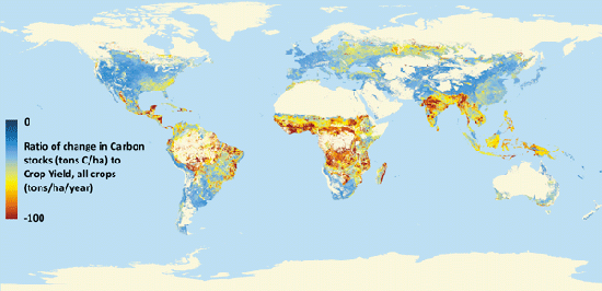 The new study utilized a combination of satellite data and government reports to determine the extent of cultivation for 175 different crop plants worldwide. Estimates of global carbon stocks in natural vegetation, obtained from a recent Intergovernmental Panel on Climate Change (IPCC) report, were based on field measurements and averaged according to vegetation type, climate and continent. The data were then used to quantify and map the tradeoff between carbon stocks and crop production globally on a grid at a resolution of 10 kilometers by 10 kilometers.