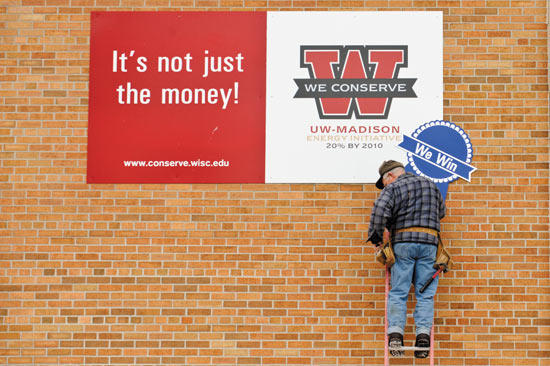 Brian Klock, a carpenter in Facilities, Planning and Management, installs a blue ribbon with the words “We Win” on a We Conserve sign located on Engineering Hall. The blue ribbons, which Klock placed on all We Conserve signs across campus, mark the success of the environmental stewardship program, which exceeded a 2006 goal of reducing campus energy use by 20 percent by 2010.