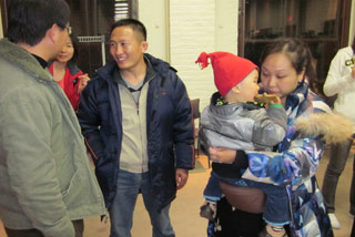 Wrestling coach Chen Delong, center, chats with members of Madison’s Chinese community as his spouse Ji Yana and son Chen Sihan, right, enjoy a welcome snack.