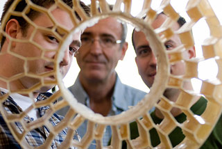 In this 2008 file photo UW-Madison mechanical engineering graduate students Eric Foltz (left) and Nick Newman (right), along with faculty adviser Tim Osswald (center), look through the honeycomb pattern of an early prototype of a non-pneumatic tire they helped create.