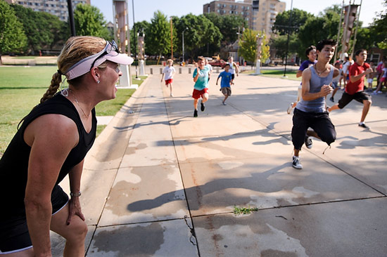 Olympic runner Suzy Favor Hamilton, a 1991 graduate of UW-Madison, runs through a human tunnel created during a Movin’ Minds exercise class with nearly 100 middle-school students held outside of the Kohl Center on July 19, 2011.