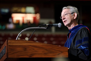 Interim Chancellor David Ward speaks to thousands of first-year students during the Chancellor’s Convocation for New Students on Sept. 1, 2011. (Photo: Jeff Miller)