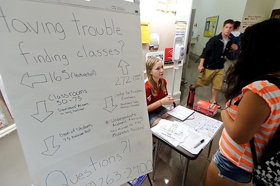 Jodie Perman (left), a visitor guide with Visitor and Information Programs, helps students locate their classrooms in Bascom Hall during the first day of class.