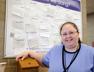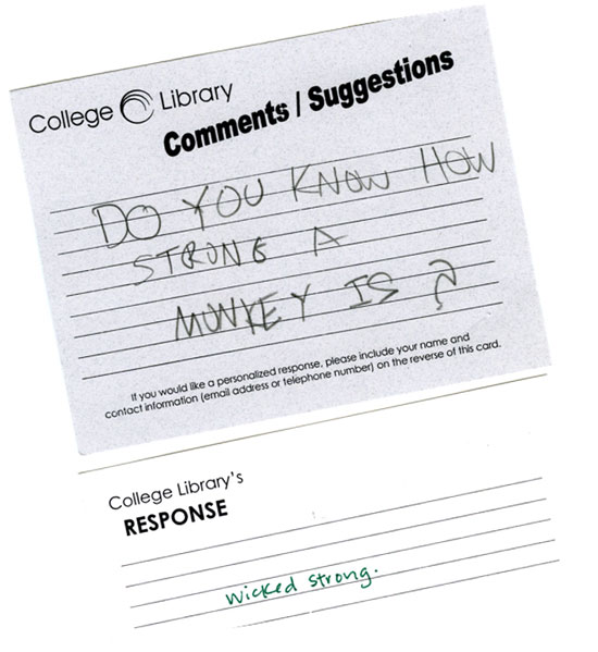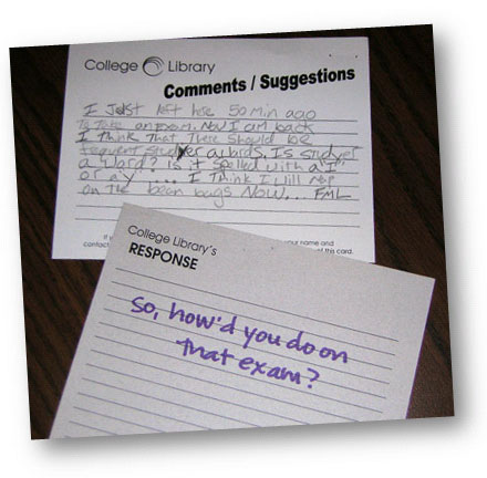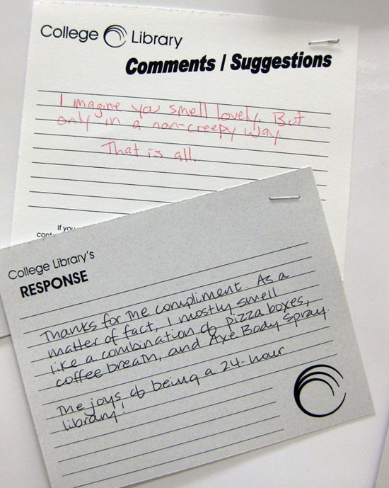 Pamela O’Donnell: I first started with the comment/suggestion board before all of the social media. Before we had Twitter and Facebook, this was our way of creating dialogue with the students. They’d make a comment, and often times you’d write a response and they’d write a note on the card and follow up on it. It was an interesting way to develop a relationship. I feel a lot of responsibility to make sure I’m entertaining. Students really like the fact they can make a comment, it’s acknowledged, we hear them and even if we can’t put in an electrical outlet every foot of the library, they understand our wish to accommodate them. It’s their chance to express themselves and have a little fun.