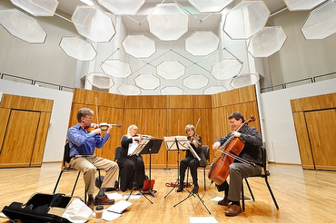 Members of the Pro Arte Quartet rehearsal at Mills Hall in the Mosse Humanities Building on Sept. 27. Pictured (left to right) are David Perry, Suzanne Beia, Sally Chisholm and Parry Karp.