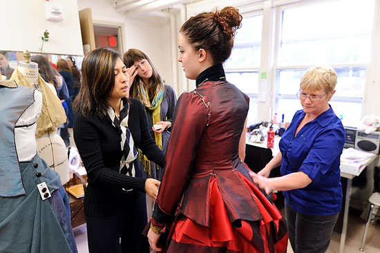 Costume designers Sydney Krieger (right) and Hyewon Park (left) work on the fit of a costume worn by University of Wisconsin–Madison undergraduate Caitlin Miller (center) for the upcoming UW Opera performance of “La Boheme.” Also pictured is undergraduate Katherine Peck (center left).