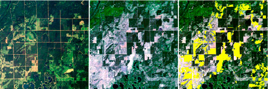 Mutlu Ozdogan, assistant professor of forest and wildlife ecology at the UW–Madison, processes images from the Landsat satellite to reveal changes in forest composition over time. Pictured in this composite is the dry pine-barren forest of Bayfield and Douglas counties in northwestern Wisconsin in 1989 (left) and 1995 (center). Vegetation appears green in these true-color images. A computer algorithm compared the 1989 and 1995 images and identified yellow areas in the right panel as having been harvested in the interim.
