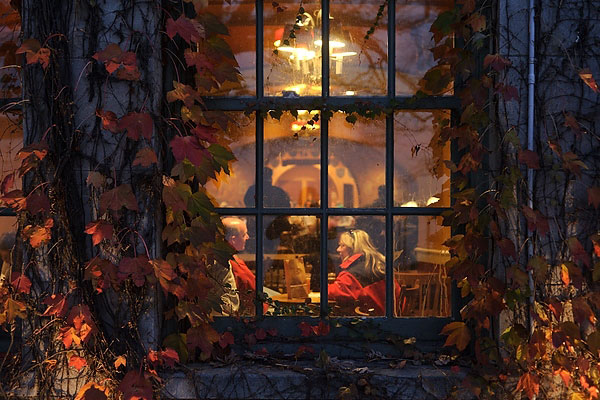 Autumn-colored foliage clings to the exterior windows of the Memorial Union as nighttime falls and visitors talk inside under the warm glow of lights at the Rathskeller.