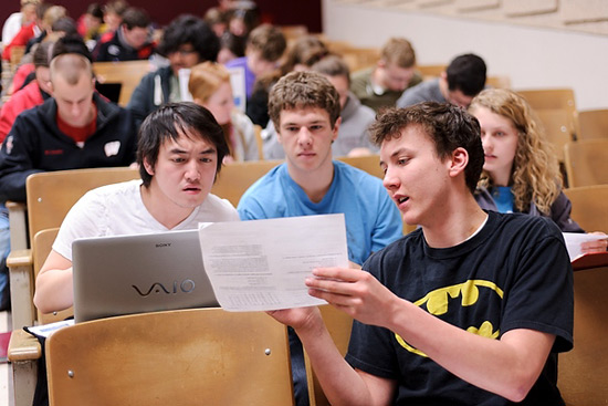 A laptop computer provides another resource as students discuss questions and answers in small groups during an open test in an undergraduate zoology class taught by David Abbott, professor of obstetrics and gynecology in the School of Medicine and Public Health.