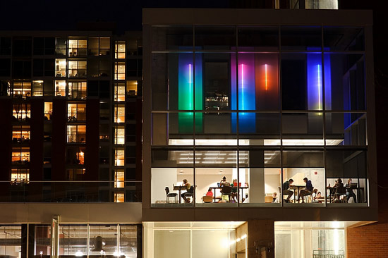 Below the glow of multi-colored lights, students are seen studying in a common area of 333 East Campus Mall on March 21, 2012.