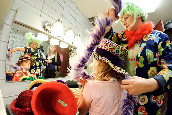 Anita Laabs (right) helps Savanna Shropshire (left) try on an assortment of costumes in a dressing room backstage at the Wisconsin Union Theater’s “Curtain Down Party” and open house event on May 12, 2012. The event allowed patrons to explore areas of the theater rarely open to the public, and was a farewell to the space prior to closing for a two-year renovation.
