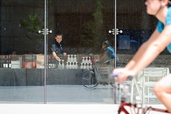 On June 21, 2012, catering staff set out glassware in advance of an event being held at the Chazen Museum of Art. Outside in the foreground, a bicyclist passes by the museum’s glass-walled foyer.