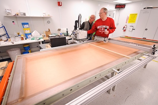 Associate instrument innovators Leland Greenler, left, and Dan Wahl measure the individual tension of thousands of tiny woven wires that make up a prototype neutrino-target screen being designed at the UW–Madison Physical Sciences Lab.