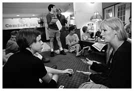 Story Matkin-Rawn (left) and Marjorie Cook (right) share thoughts in a hotel-lobby-turned-classroom in Selma, Alabama.