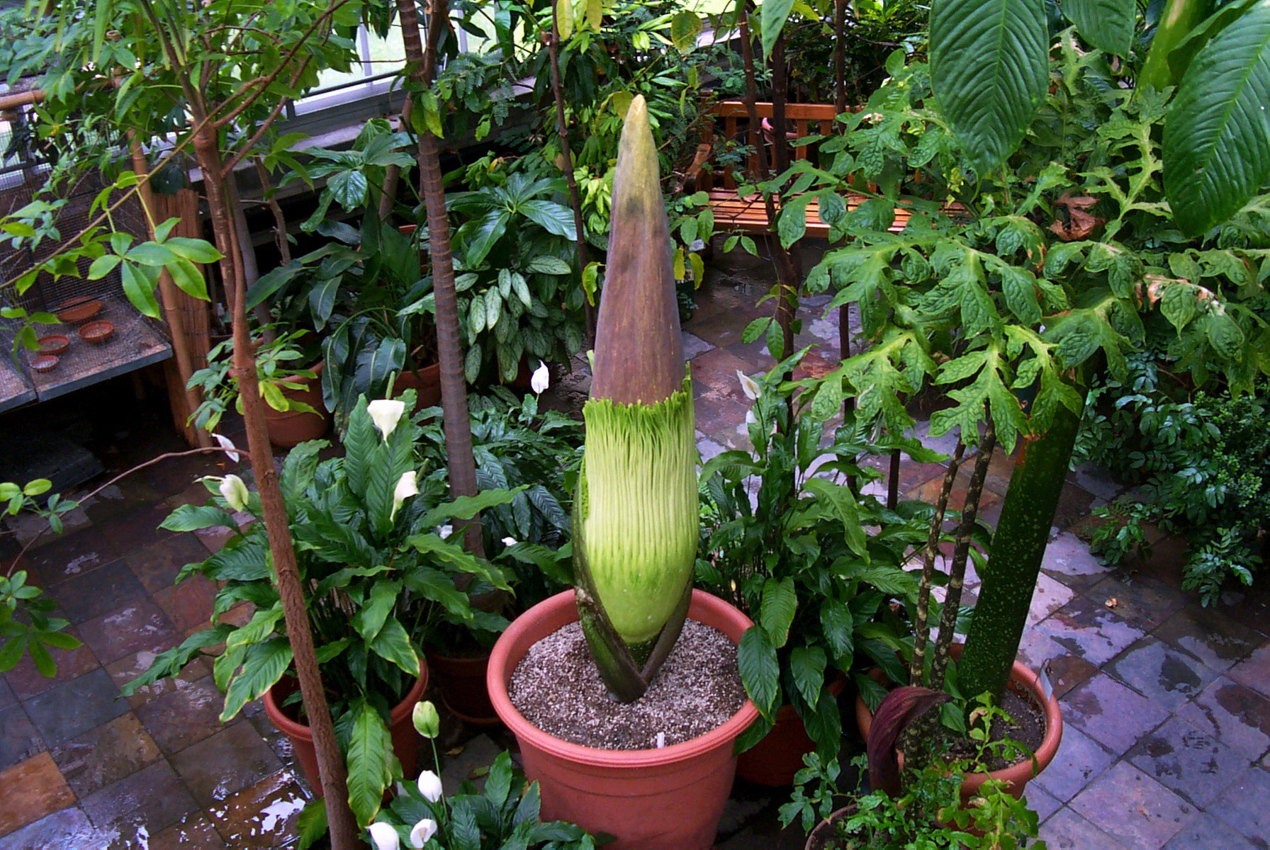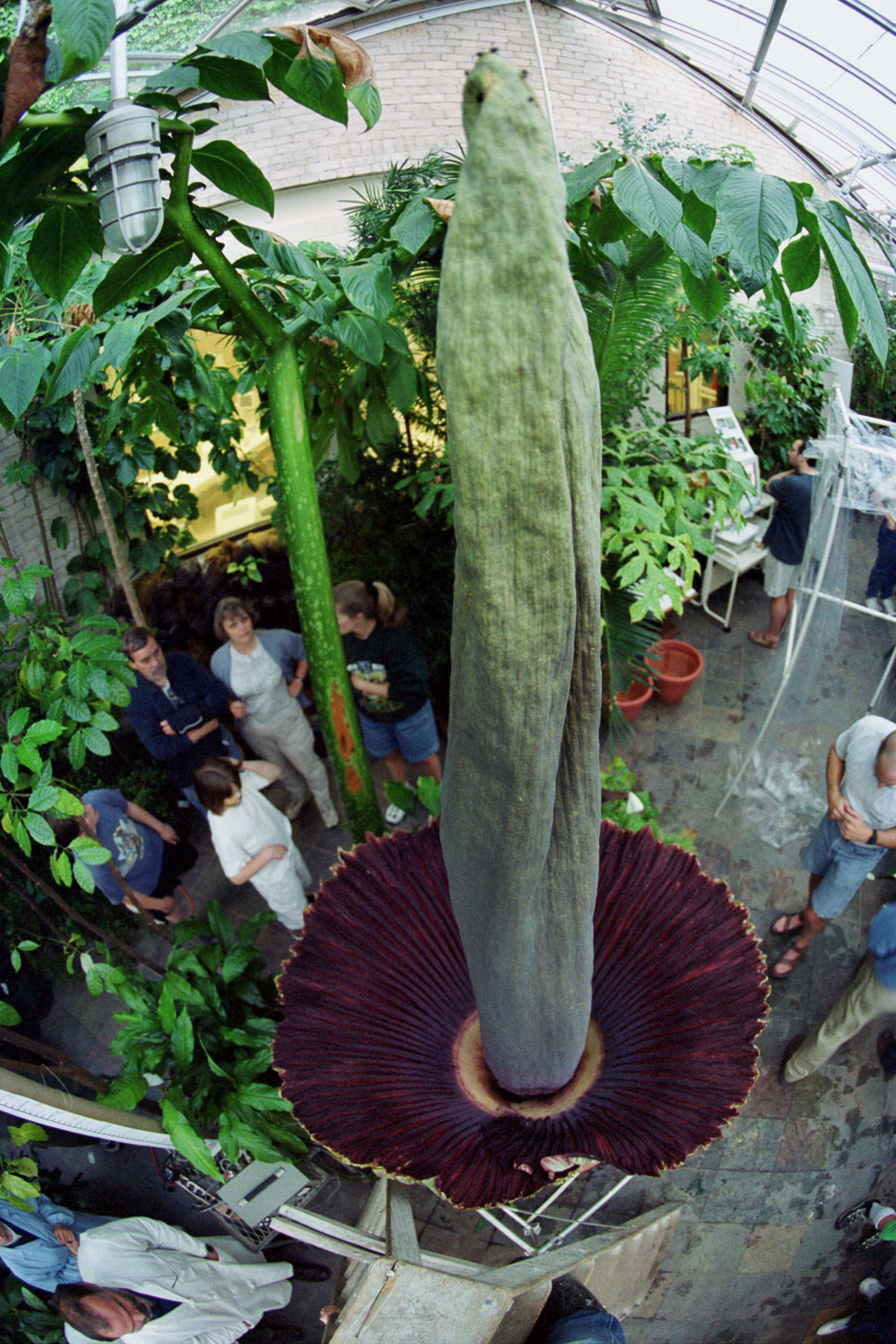 Caption: At 6 p.m. on June 7, 2001, the 101-inch tall Titan Arum or "corpse flower" in the UW-Madison Botany Greenhouse blooms. The flower gradually opened over the course of 6 hours.