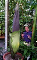 Caption: Herbarium director Paul Berry speaks to visitors as they crowd around the corpse flower (Titan Arum), a rare and malodorous flowering plant that blooms only two or three times during an average 40-year life span. The 101-inch tall flowering plant bloomed June 7 in the UW-Madison Botany Greenhouse.