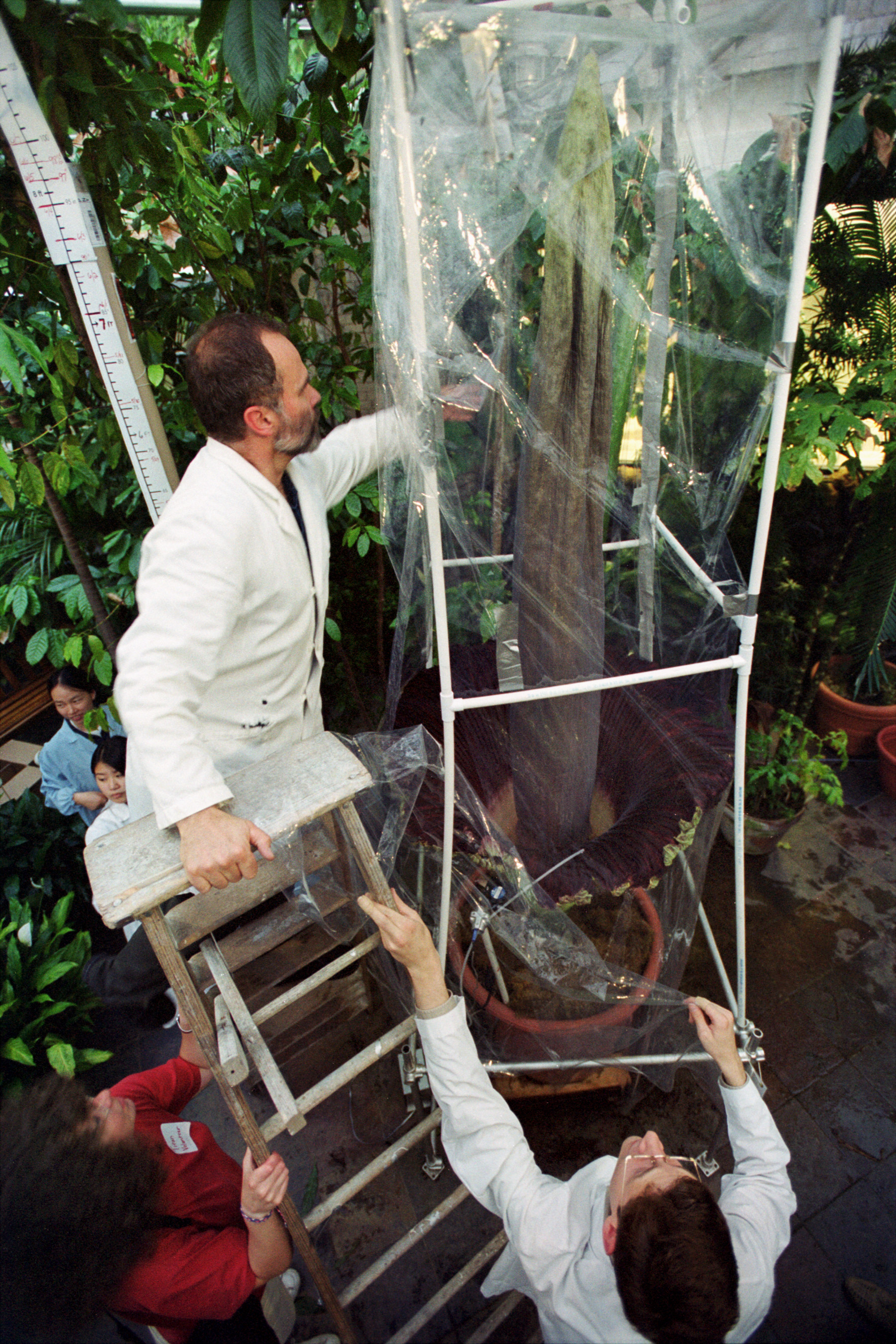 Caption: Botany professor Tom Sharkey, top, and graduate student Sean Weise, right, enclose the Titan Arum in a plastic tent in order to measure gas emissions.