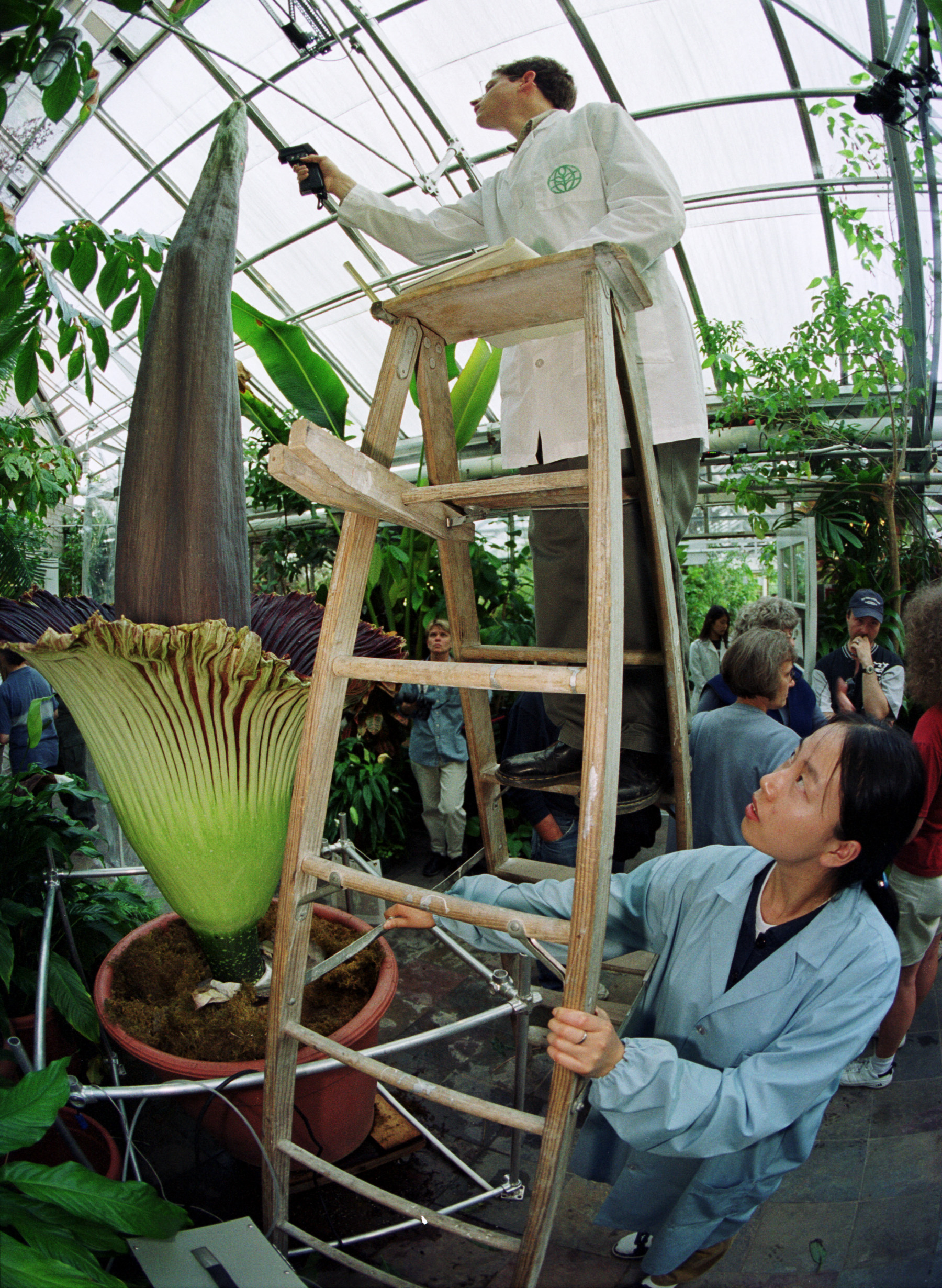 Caption: Botany graduate students Sean Weise, top, and Yan Lu measure the temperature of the Titan Arum.